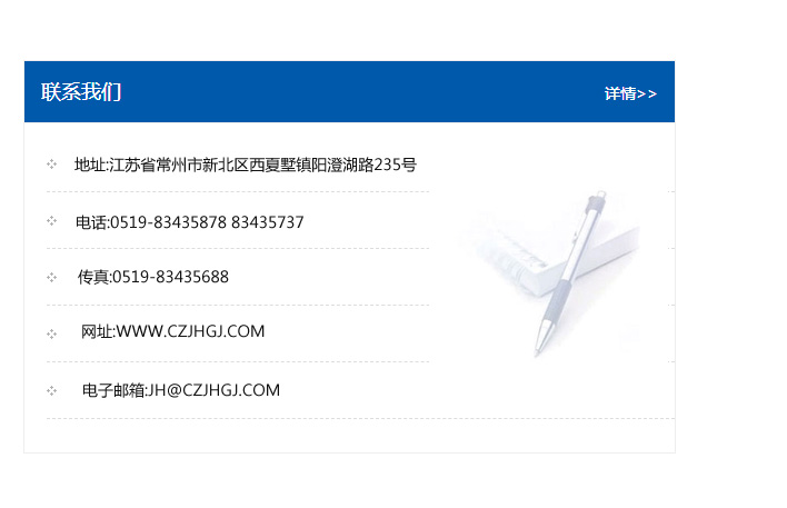 傳真:0519-83435688    郵編:213135    網址:WWW.czjhgj_com.0551yh.com    電子郵箱:JH@czjhgj_com.0551yh.com